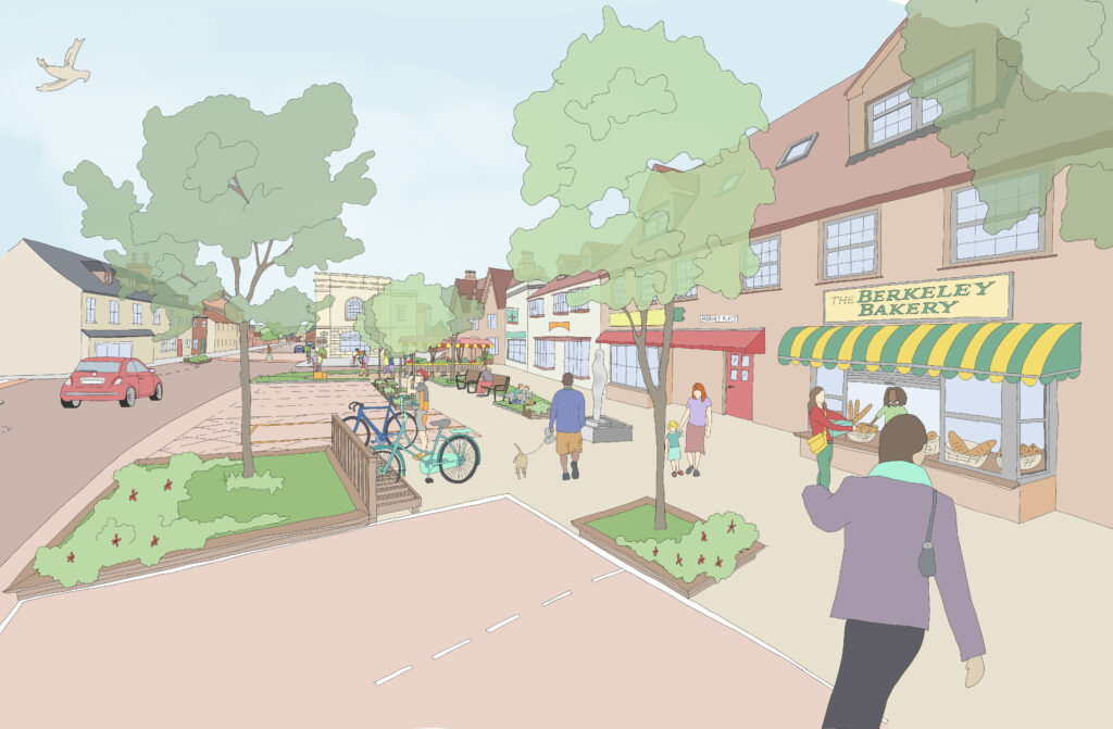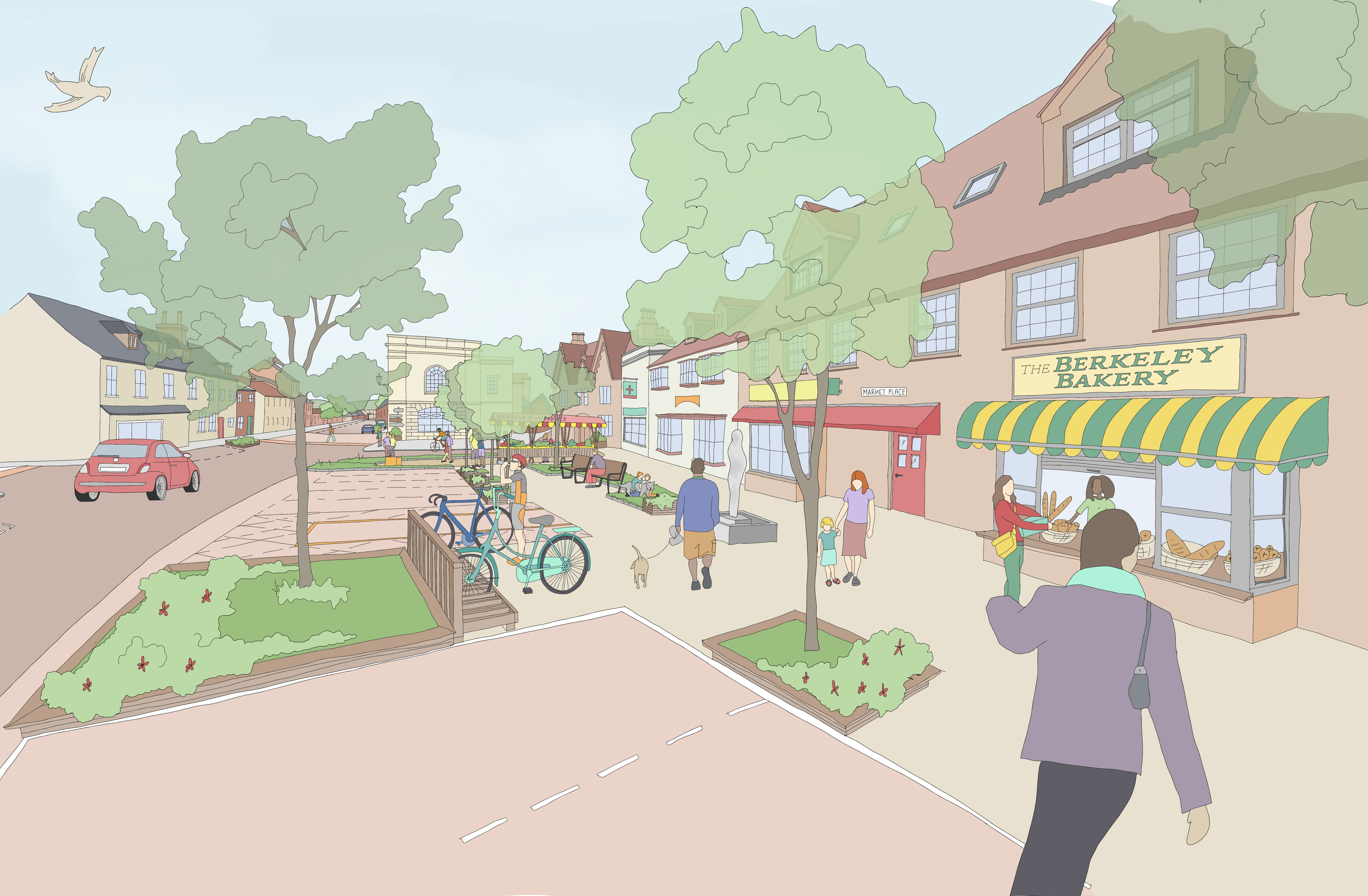Creating a people-centred place at the heart of Berkeley Town, where community and social cohesion is promoted. Prioritising pedestrians and cyclists in the town centre and creating an accessible place for all users, fostering a sense of civic pride for Berkeley.