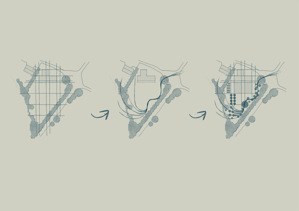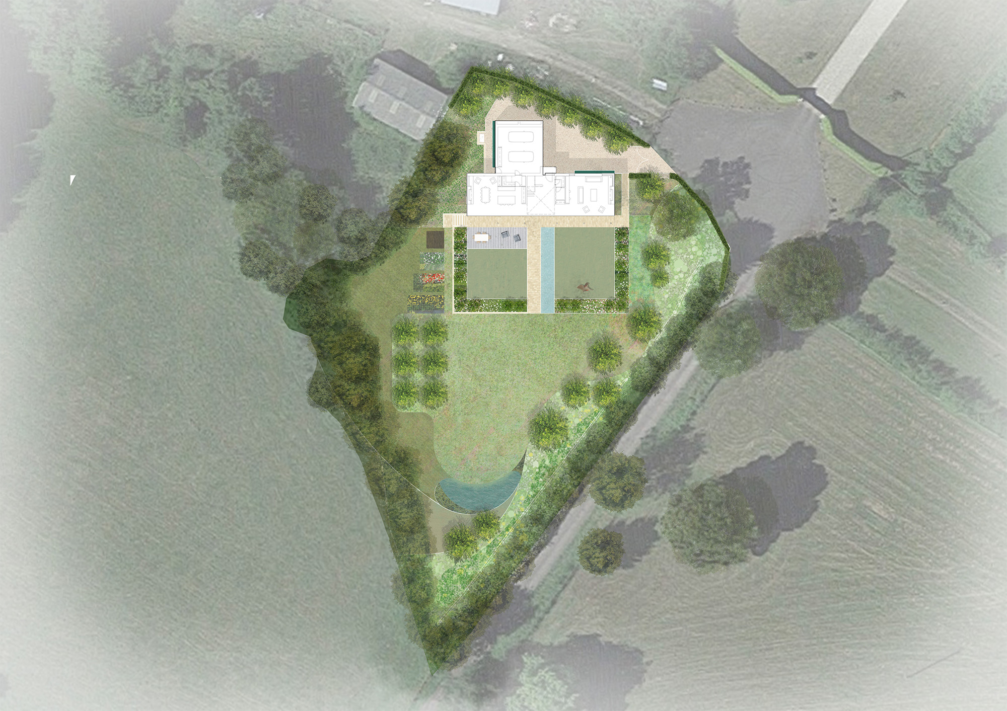 Taking inspiration from the site’s history as a nursery, the concept design uses two contrasting geometries; a formal grid forms the structure of the site, which is juxtaposed against organic forms found within the surrounding woodland setting. The design includes formal gardens directly in front of the house with a series of planting beds, a formal lawn, a reflection pool that connects with the double-height internal atrium and an outdoor dining area. A food growing area is located outside of the formal gardens including an orchard and kitchen garden.